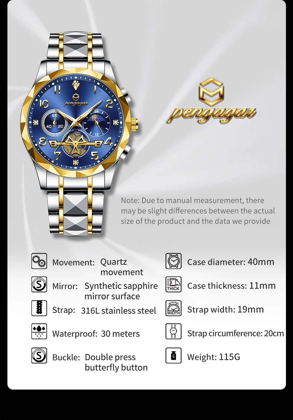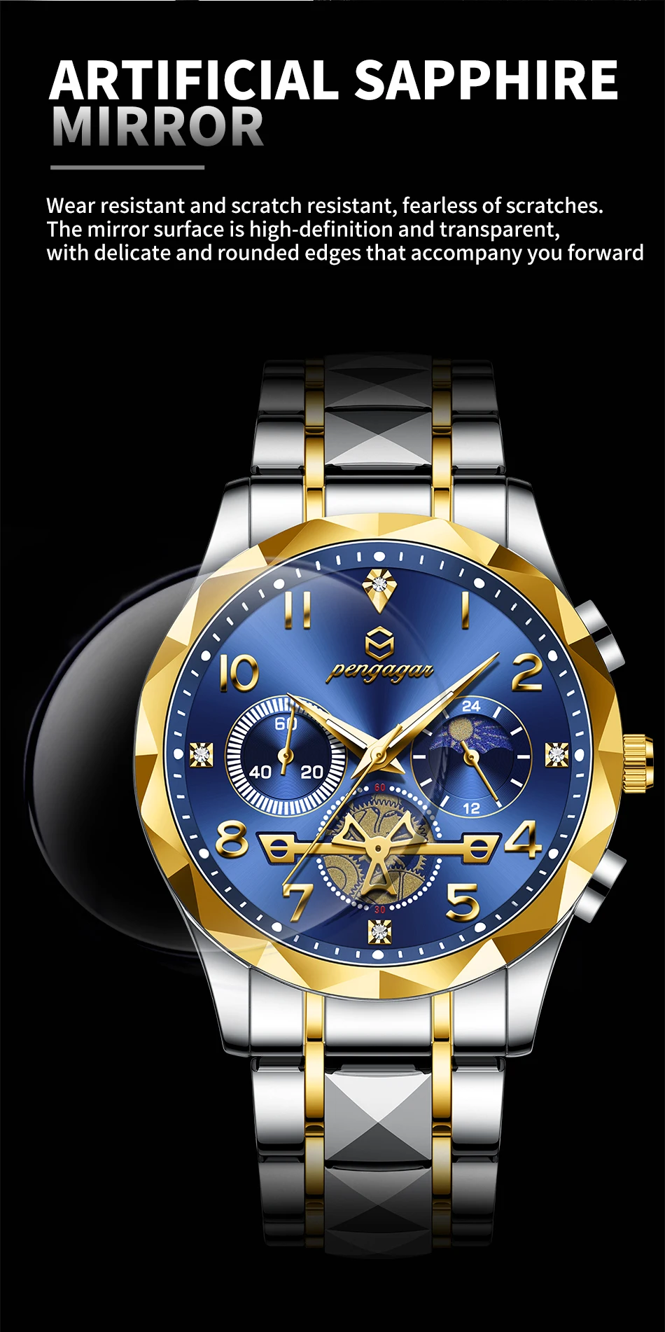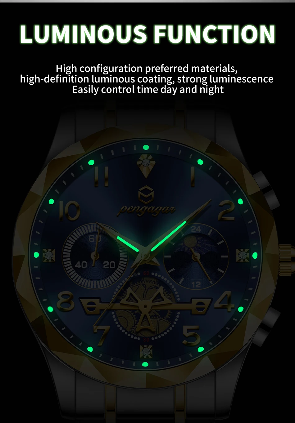 PENGAGAR Luxury Man Wristwatch Waterproof Luminous Chronograph Watch for Men Stainless Steel Men's Quartz Watches reloj hombre